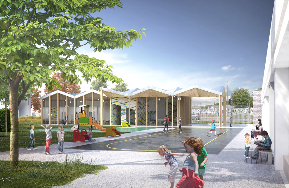 Largement ouvert vers le sud et la cour de l’école, le nouveau bâtiment de restauration offre aux enfants et aux adultes un univers ludique et lumineux. Le bâtiment est construit en ossature «légère» en charpente bois. La mise en place d’une toiture végétalisée fait écho à la présence de la citadelle de Lille à proximité immédiate du site. Côté cour, au sud, les réfectoires sont vitrés pour favoriser les apports solaires et profiter de vues sur la cour de récréation et ses espaces verts. Ils sont protégés de la surchauffe par le préau et par les masques des