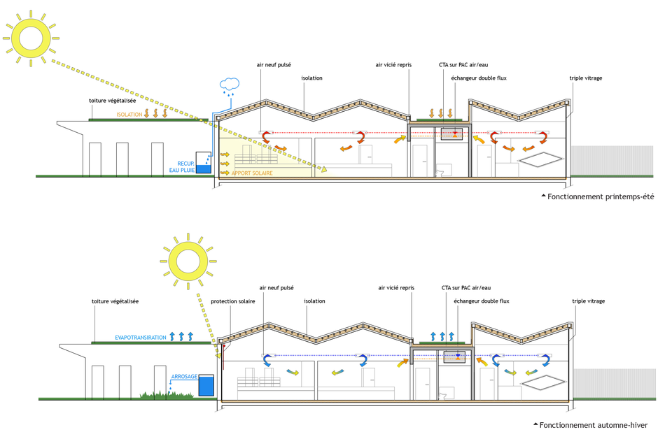 bâtiments voisins. Côté rue, au nord, les ouvertures sont limitées pour limiter les déperditions thermiques.
