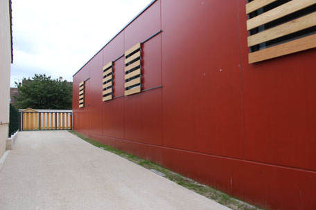 L’extension s’adosse au bâtiment existant et se trouve en léger recul par rapport à la façade sur rue de manière à affirmer une nouvelle entité. Il s’agit, à l’image de l’extension précédente d’un volume sobre avec une toiture terrasse. L’extension s’inscrit en zone résidentielle et est visible depuis l’espace public, les façades sont traitées en béton lasuré ocre apportant un effet brillant qui accroche la lumière.