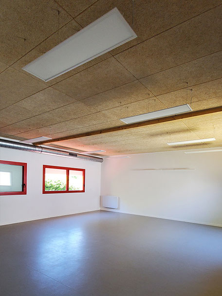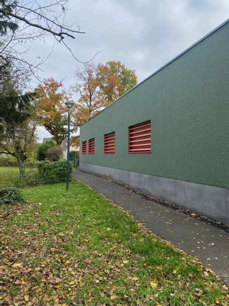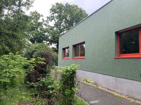 L’accueil de loisirs est également traité en enduit minérale. il a été rendu accessible aux personnes à mobilités réduites tout comme le parking.