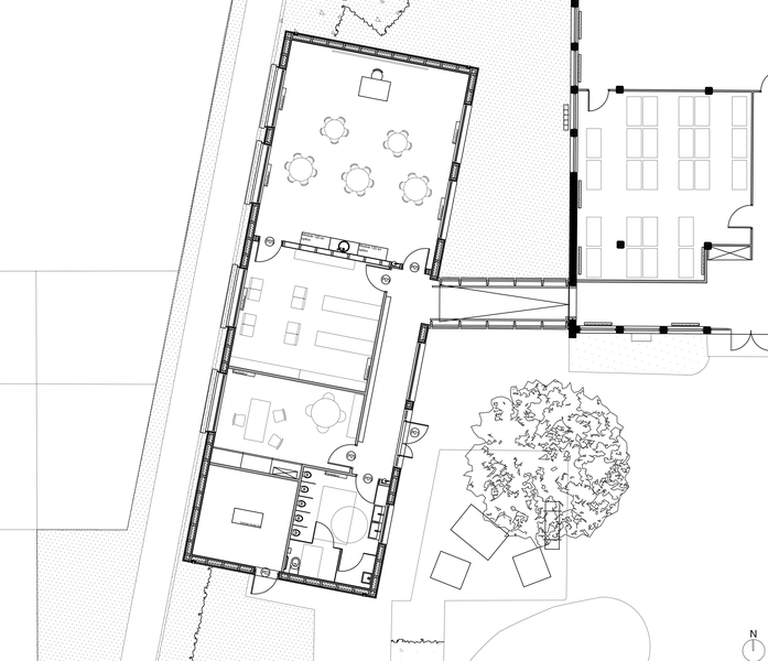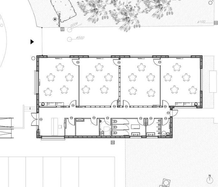 Un centre d’accueil de loisirs, détaché de l'école existante qui s'implante au sud de la parcelle. le terrain est remodelé pour l'implantation.